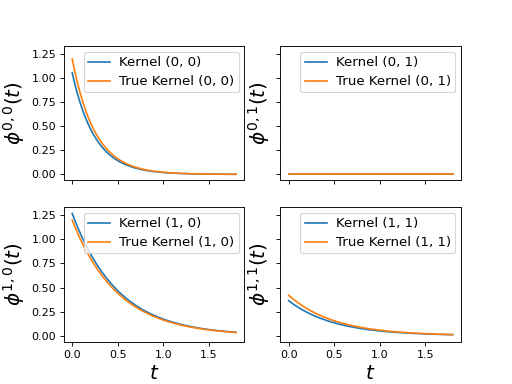 plot_hawkes_kernels(learner, hawkes=hawkes_exp_kernels)